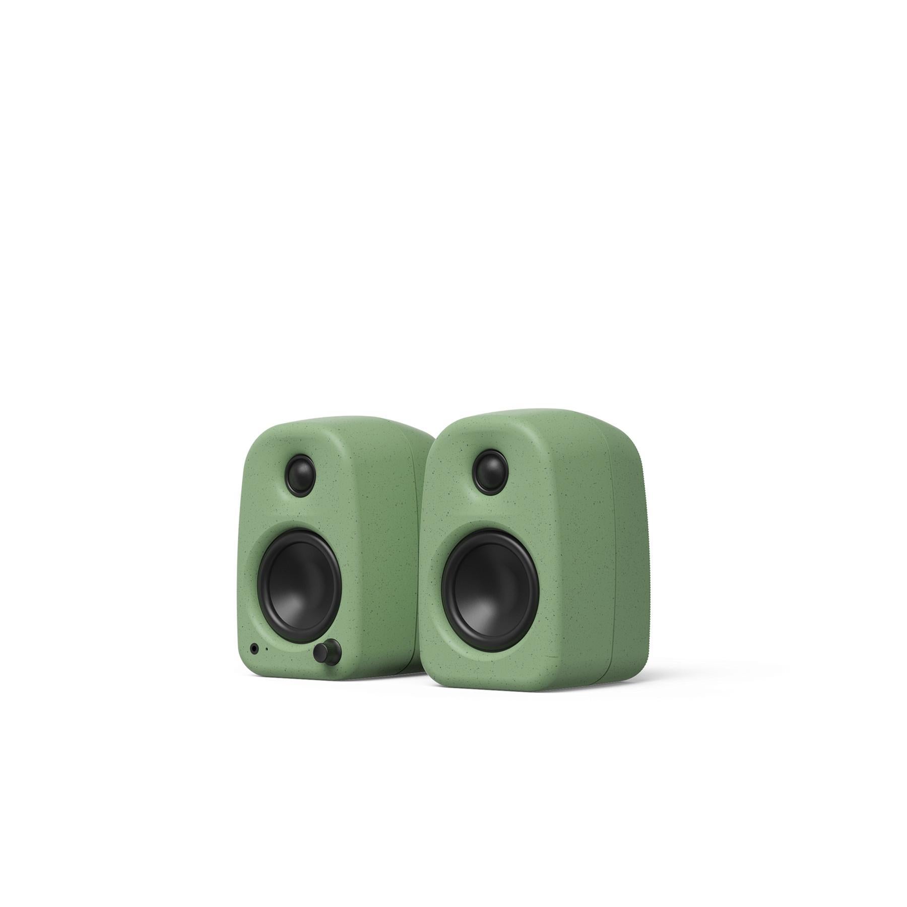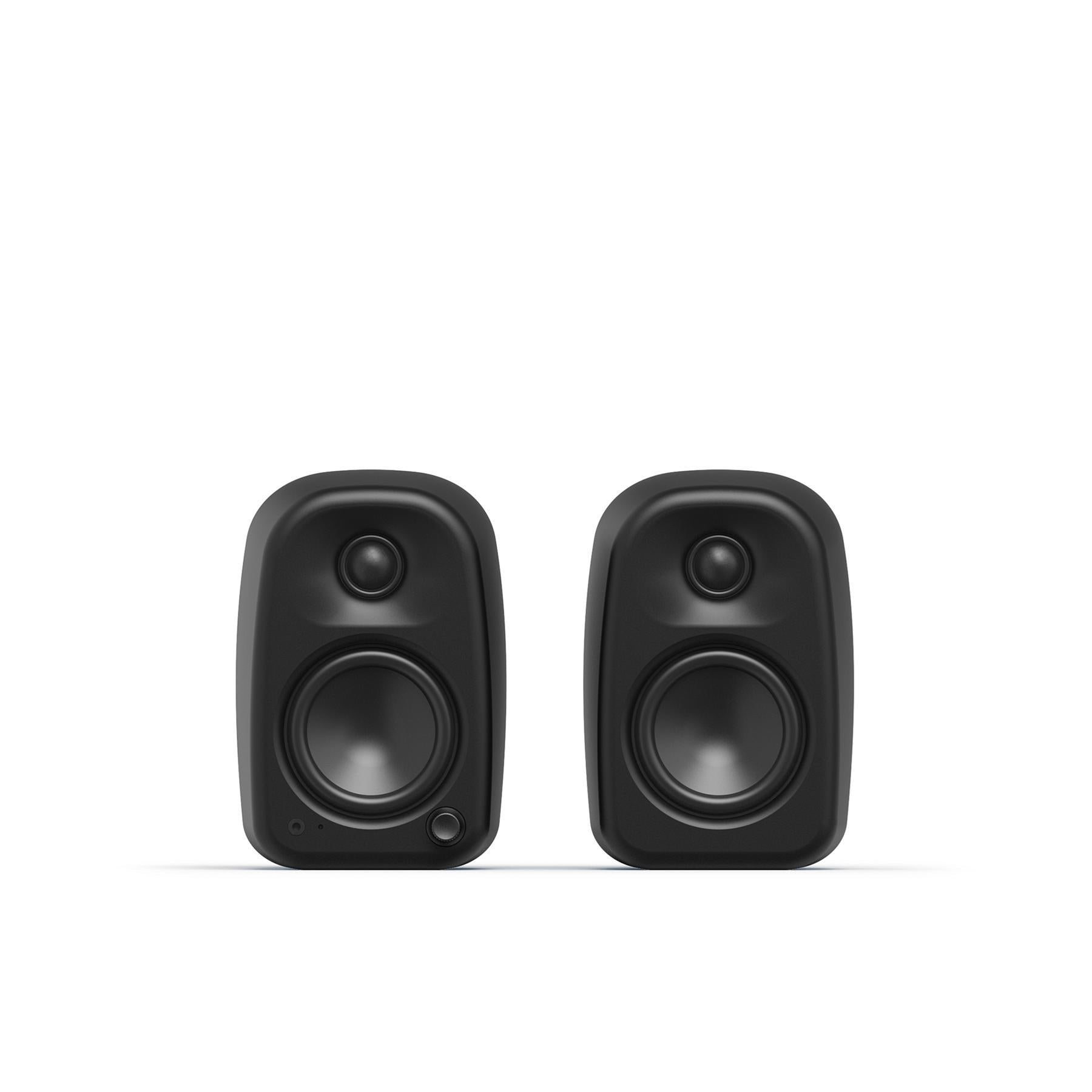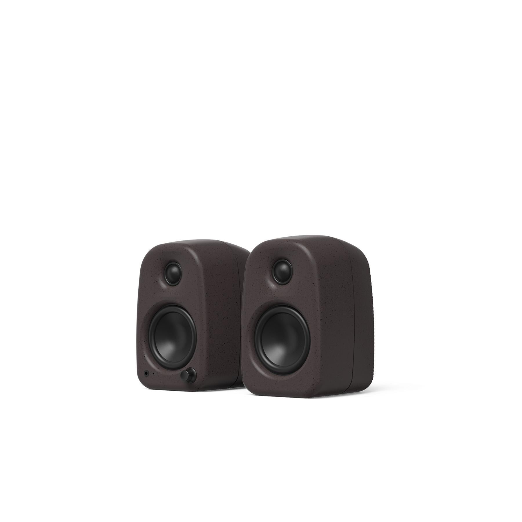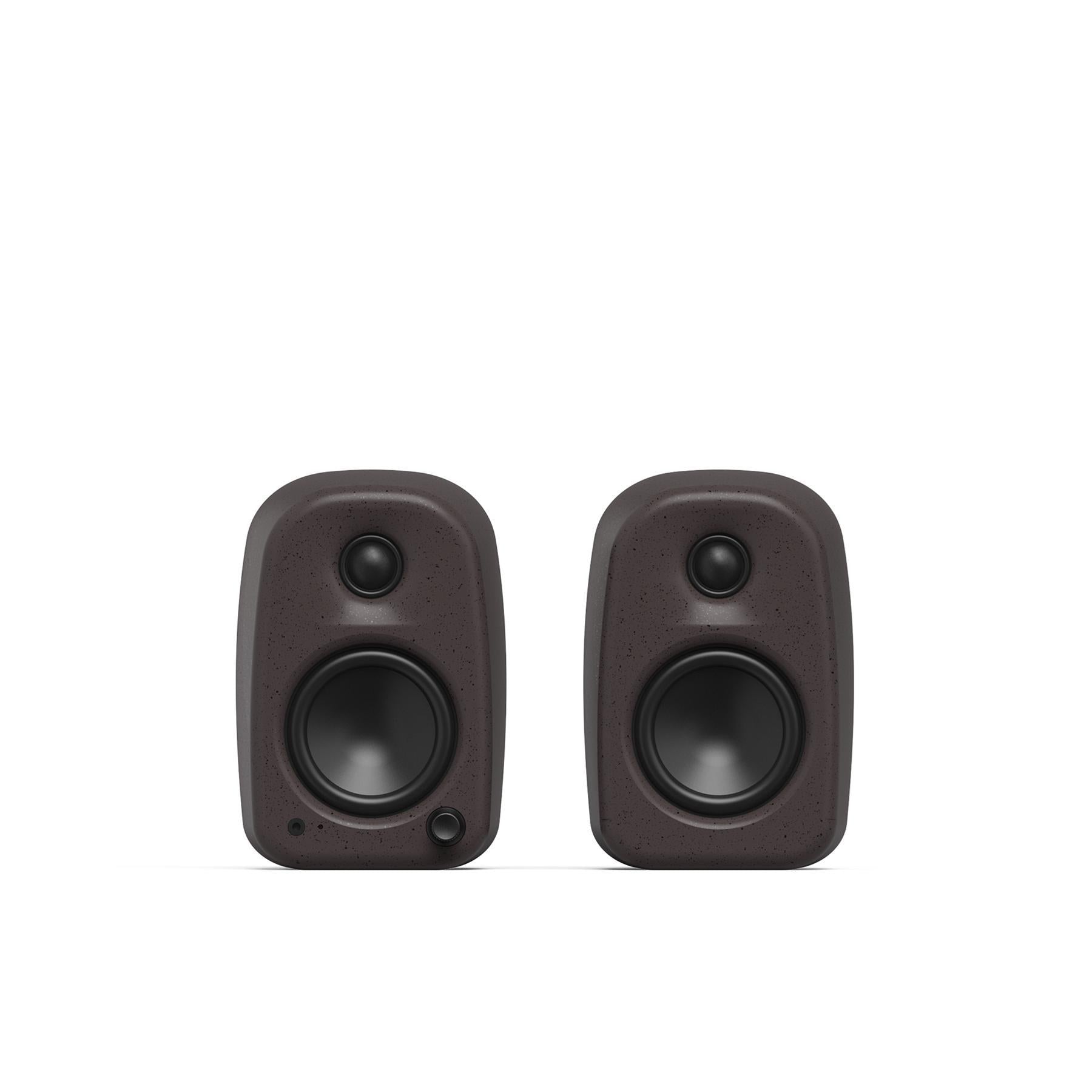The softly rounded cabinet is injection-molded from partially recycled material, giving each pair a unique flecked finish that feels more like a design object than a piece of gear. A front-mounted multifunction dial handles power, input selection, and volume, and the built-in 3.5 mm headphone jack plus selectable left/right orientation switch keep controls and connections exactly where you need them. Compact enough for small desks yet powerful enough to fill a room, Uki is a balanced, modern desktop speaker system that replaces the need for a separate amplifier, receiver, or bulky soundbar.