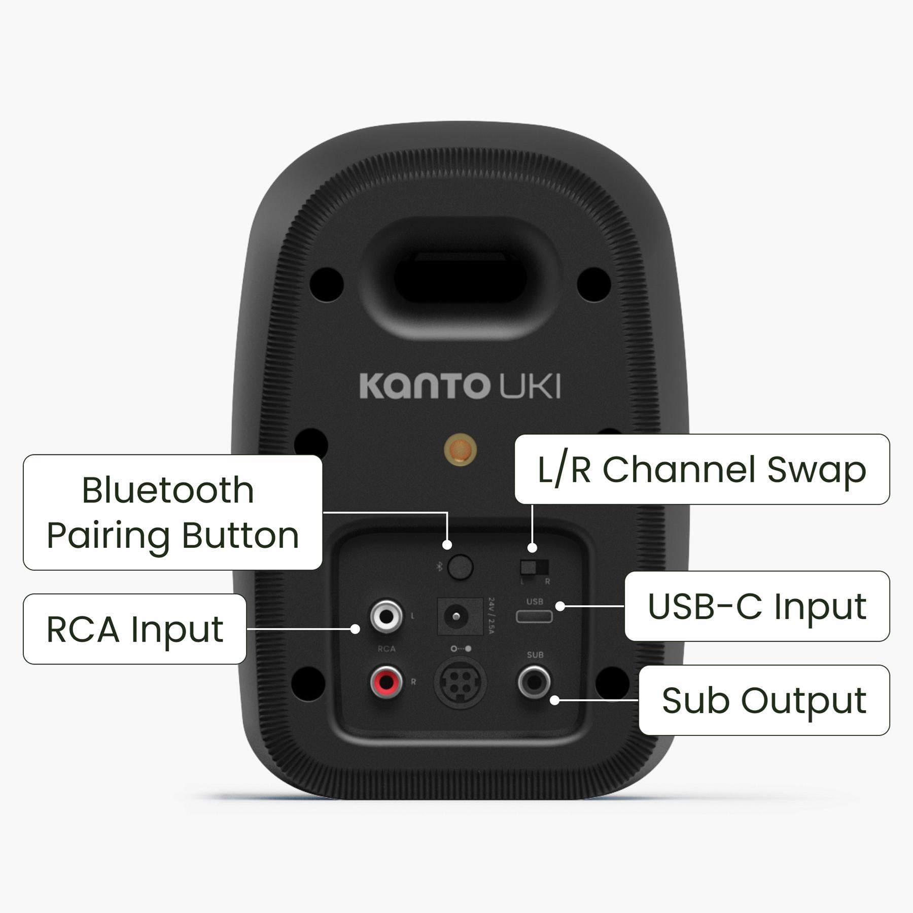 Kanto Uki compact desktop speakers are designed to bring rich, detailed sound to modern workspaces, gaming setups, and creative studios without taking over your desk. Powered by a 100 W Class D bi-amplified design with 3/4" silk dome tweeters and 3" paper cone woofers, Uki delivers smooth mids, open highs, and a surprisingly wide soundstage that remains comfortable and fatigue-free for all-day listening.With USB-C, Bluetooth 5.3, and RCA inputs, you can switch seamlessly between your computer, phone, and turntable, while a dedicated subwoofer output with automatic 100 Hz crossover lets you add deep bass without overwhelming your space.