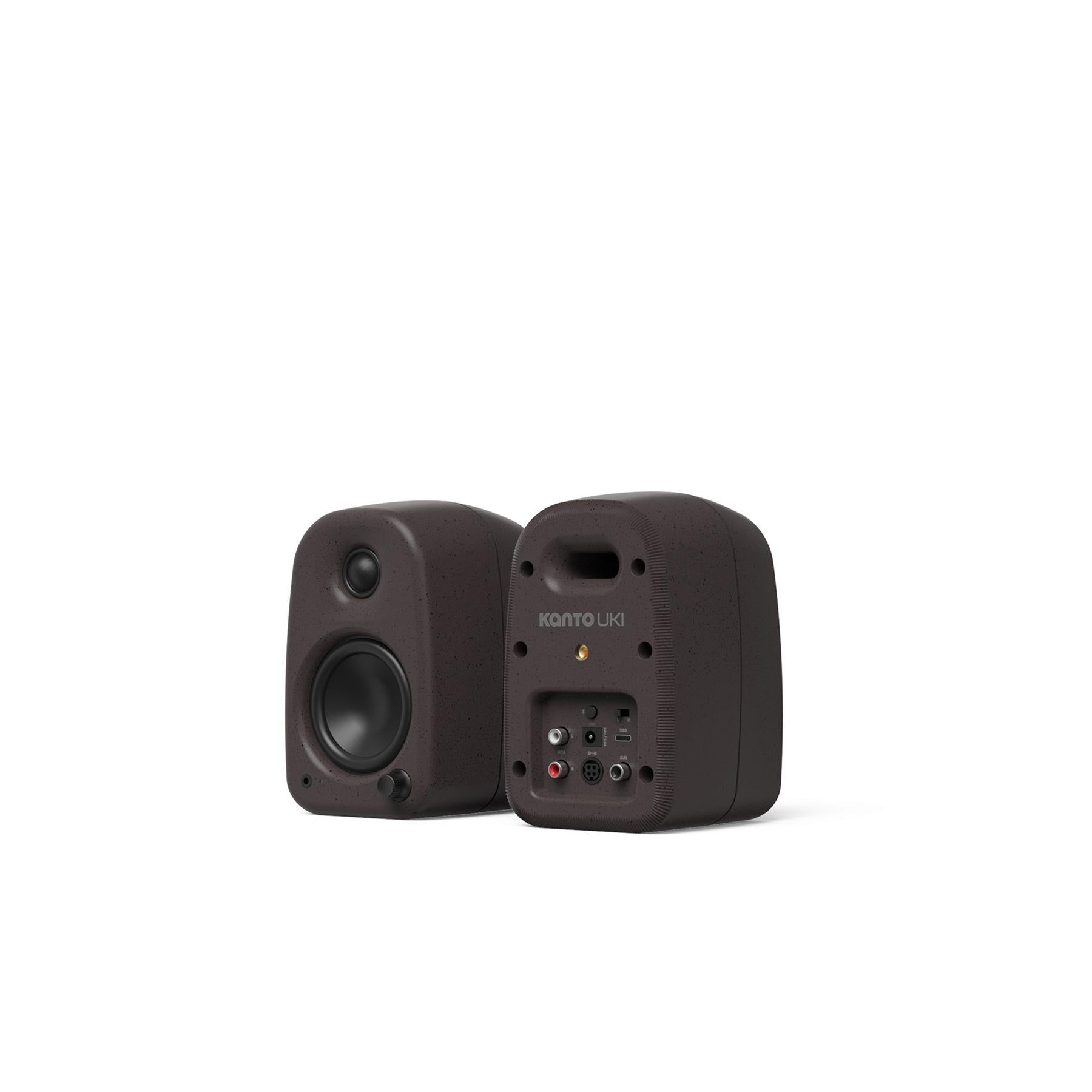 Kanto Uki compact desktop computer speakers deliver 100 W of bi-amplified power through 3/4" silk dome tweeters and 3" paper cone woofers for clear, balanced sound. With USB-C, Bluetooth 5.3, and RCA line-level inputs, they connect easily to PCs, Macs, phones, tablets, and turntables. A dedicated subwoofer output with automatic 100 Hz crossover provides an easy upgrade path for deeper bass. Their compact, recycled-fleck cabinet and front-mounted controls make Uki a stylish, ergonomic choice for modern workspaces and small rooms.