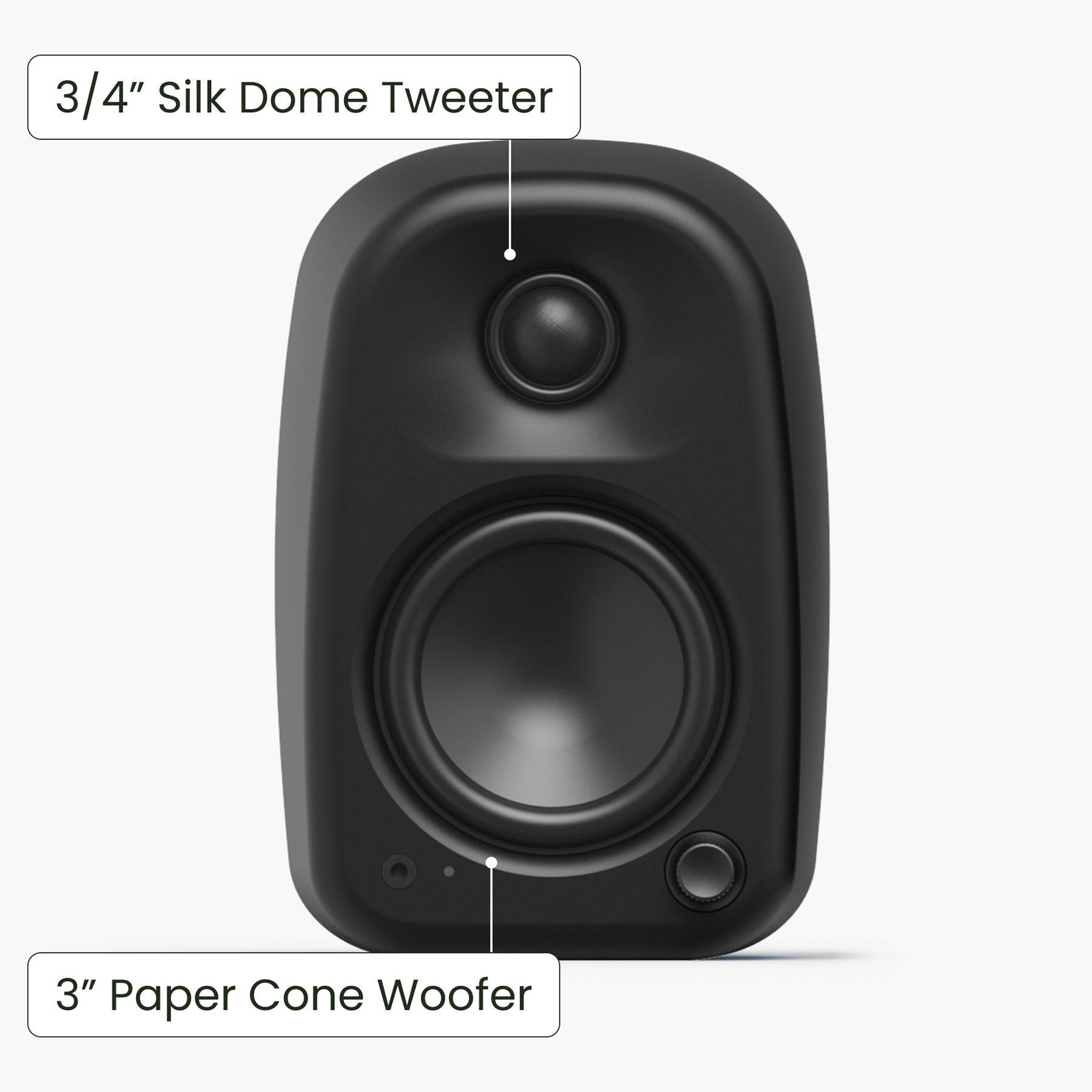 Uki’s Class D bi-amplified design delivers up to 100 W of peak power (50 W RMS) to a pair of 3/4" silk dome tweeters and 3" paper cone woofers, providing smooth mids, crisp highs, and detailed near-field imaging that belies the speakers’ compact size.