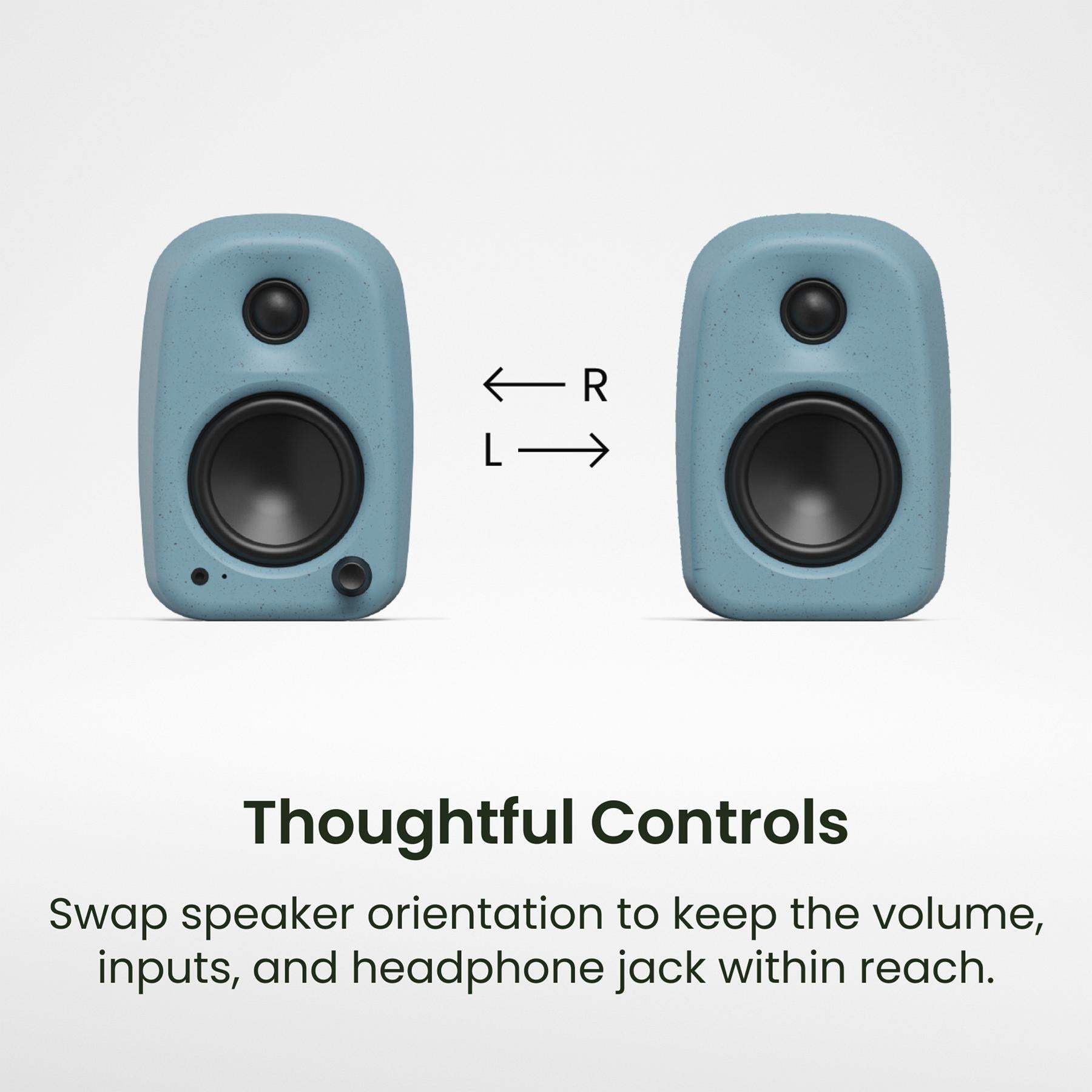 The front-mounted multifunction dial handles power, volume, and input selection in one place, while the built-in 3.5 mm headphone jack and rear L/R orientation switch ensure that both the controls and headphone port can always sit on your preferred side of the desk.