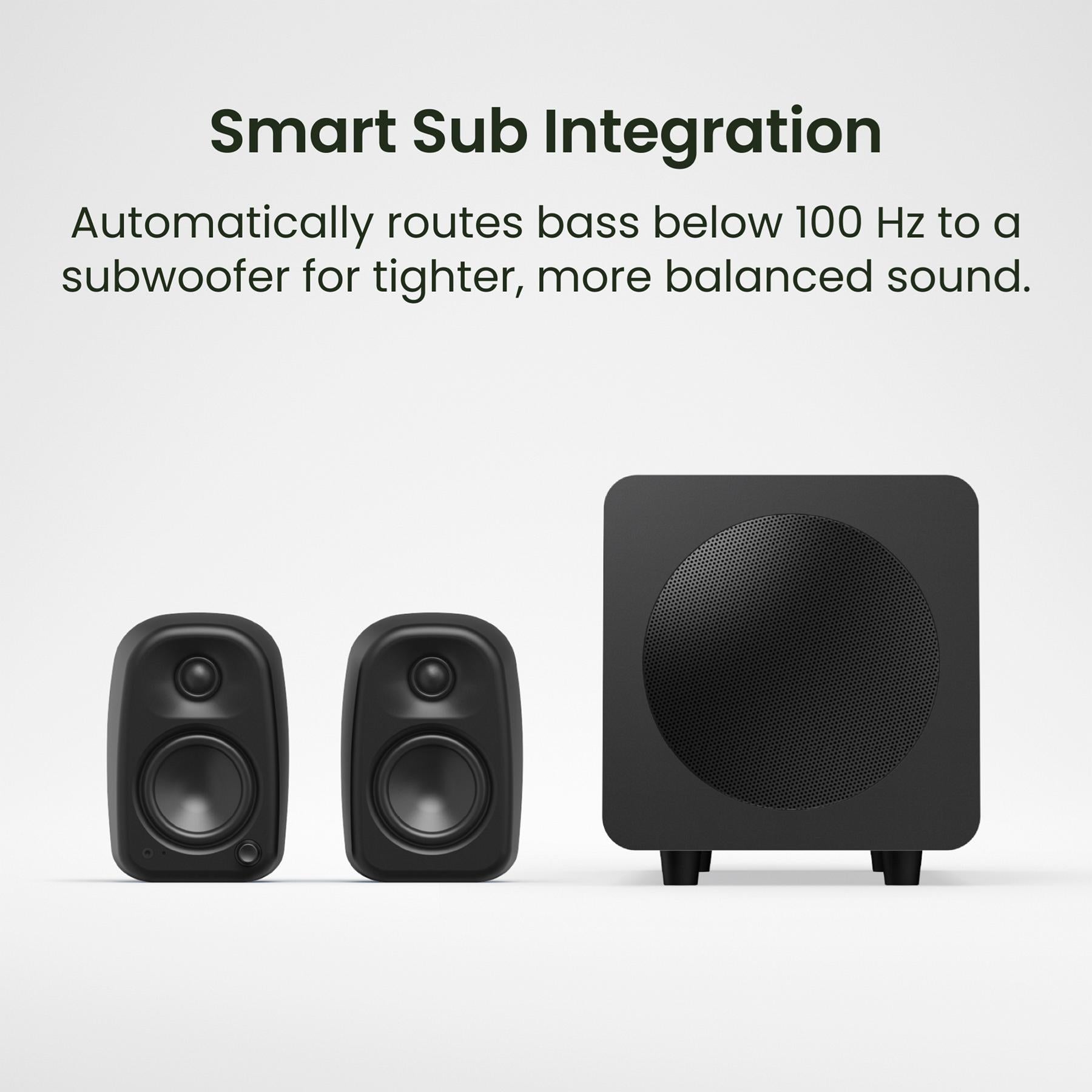 A dedicated subwoofer output makes it easy to add a powered sub, while an automatic 100 Hz high/low-pass filter offloads deep bass to the sub and frees the main drivers to focus on clarity and transients, resulting in cleaner, more balanced full-range sound even in small rooms.