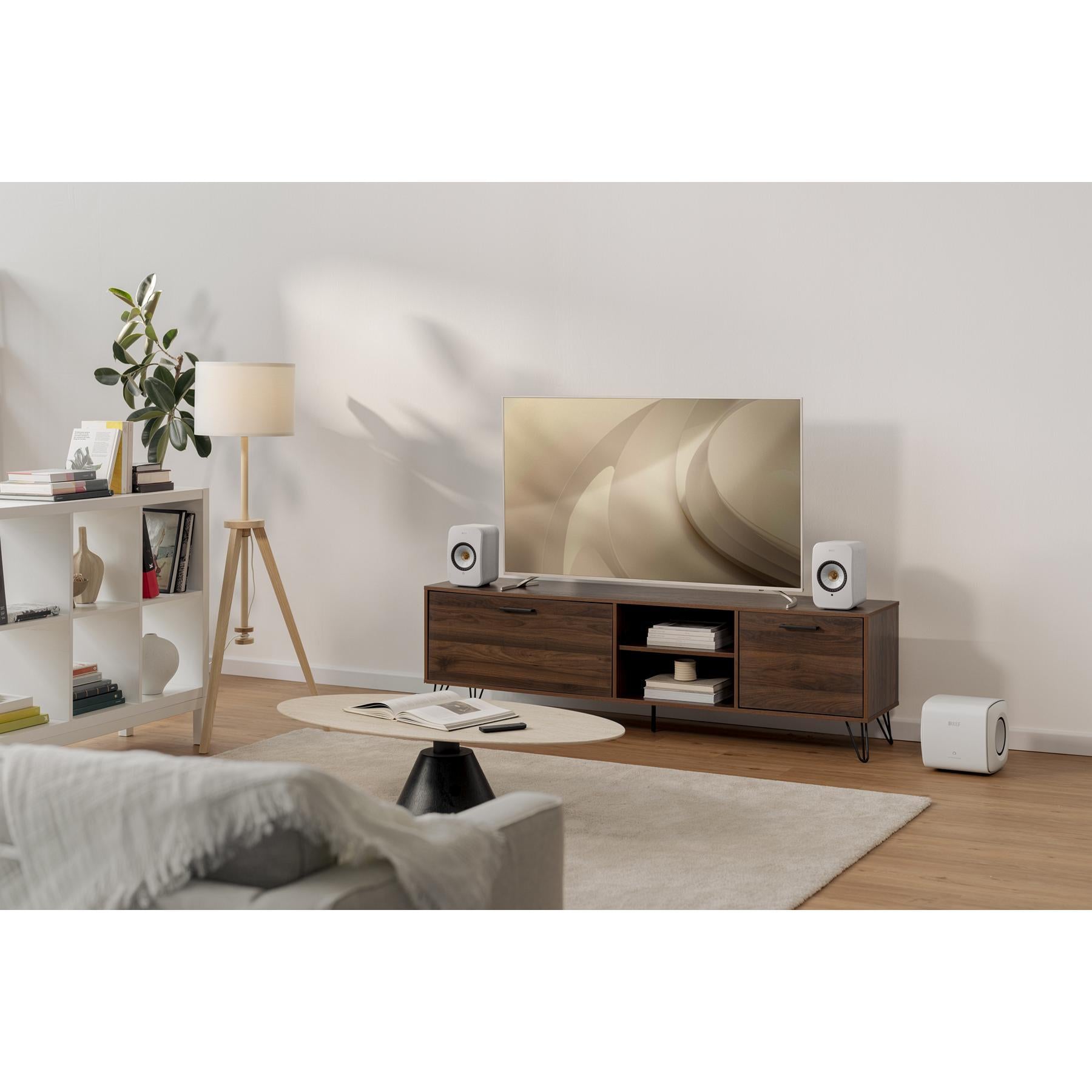 KEF LSX II is a compact wireless HiFi speaker system that delivers true stereo sound with KEF’s Uni-Q driver and built-in 100 W amplification per speaker. Connect instantly via HDMI ARC, USB-C, optical, or 3.5 mm, and stream in high-resolution over AirPlay 2, Chromecast, Bluetooth 5.0, Roon, and UPnP. Network playback supports up to 24-bit/384 kHz with support for MQA, DSD, FLAC, ALAC, and more. Designed by Michael Young, the fabric-wrapped cabinets come in modern finishes that suit desktops, shelves, and small rooms.