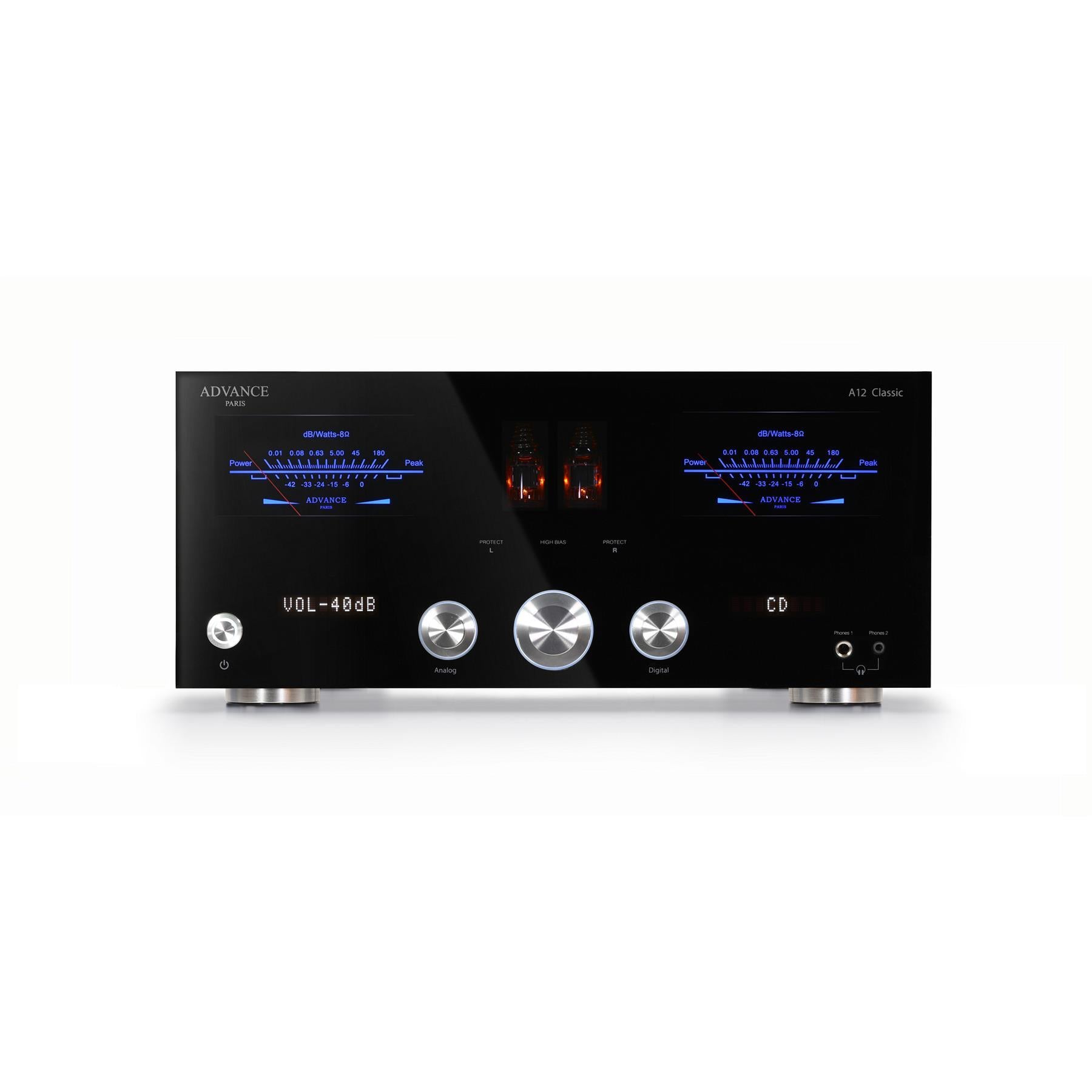The Advance Paris A12 Classic is a hybrid, dual-mono integrated amplifier that blends tube pre-amplification with a high-current Class A/B output stage for warmth, punch, and control. Rated at 190W x2 into 8Ω (280W x2 into 4Ω ) and powered by twin toroidal transformers , it drives real-world speakers with ease while keeping noise and distortion vanishingly low. Connectivity is best-in-class - HDMI ARC for TV audio, USB-B for computer playback, AES/EBU , three optical and three coaxial inputs, balanced XLR and five RCA line inputs, plus a MM/MC phono stage . Thoughtful touches like a Hi-Bias switch (first watts in pure Class-A), dual sub outputs , A/B speaker terminals , headphone gain/impedance controls , and retro-cool VU meters make the A12 Classic both flexible and fun to live with.