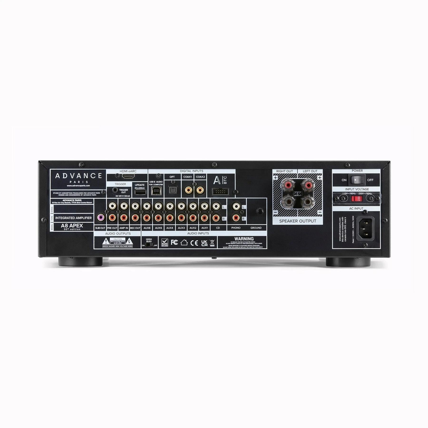 Advance Paris A8 APEX Hybrid Integrated Amp | HDMI eARC, ESS9018 Meet the A8 APEX , a compact hybrid integrated that blends ECC81/12AT7 tubes with Class A/B power for a rich, dynamic sound - plus modern conveniences like HDMI eARC , USB DAC (PCM 24-bit/192 kHz & DSD64/128 ), and a dedicated MM phono stage . Power is real-world strong at 76 W/8 Ω and 110 W/4 Ω , with a High-Bias switch that extends Class-A operation for smoother, more natural textures. Thoughtful connectivity (eight analog inputs , pre-out , amp-in , sub-out , rec-out , 12V trigger ) and the brand’s neo-retro VU meters complete a design that drops effortlessly into both hi-fi and TV systems. This special 30th Anniversary black finish with white VU meters marks three decades of French hi-fi craft.