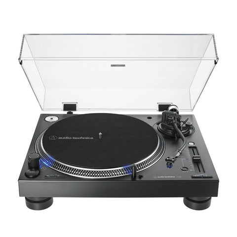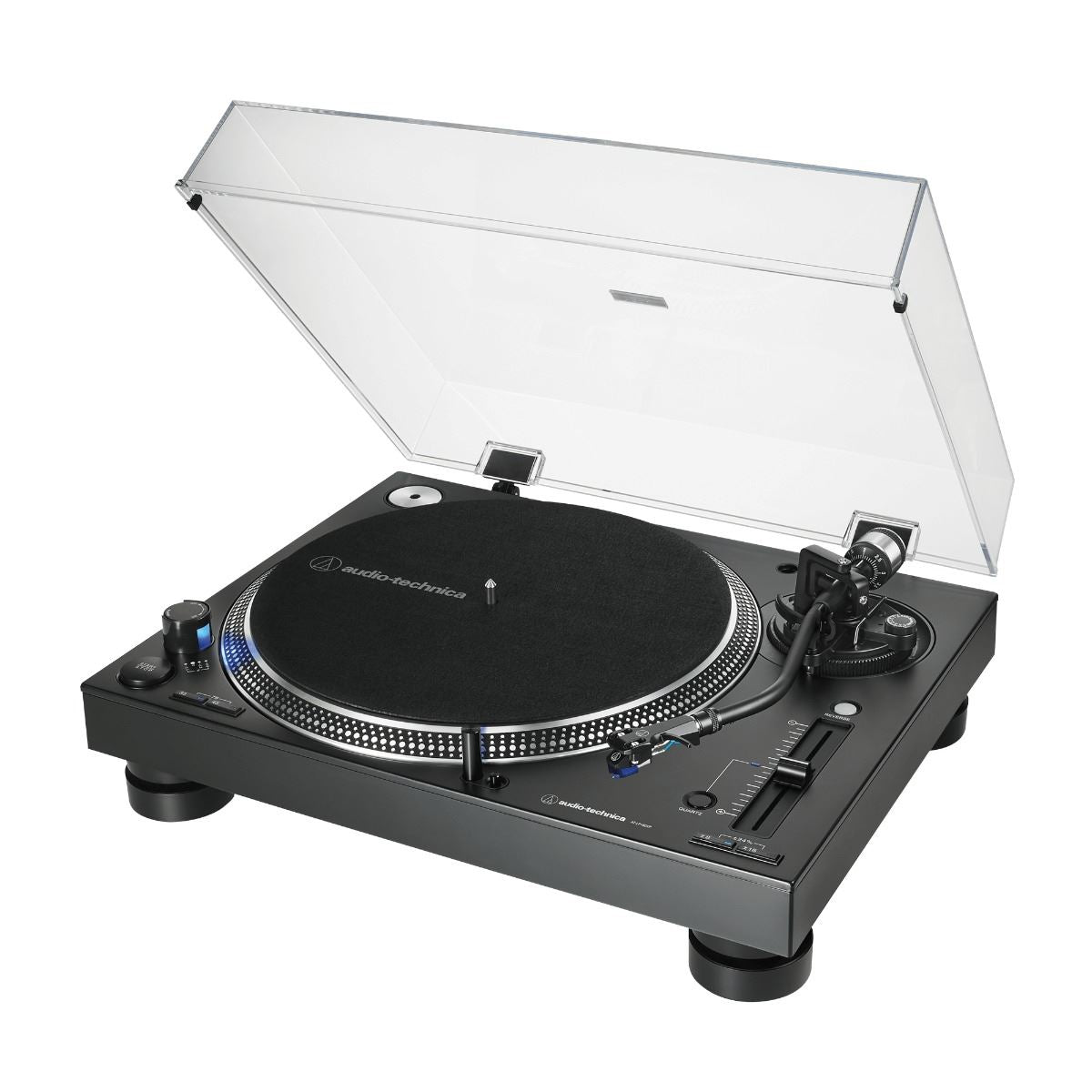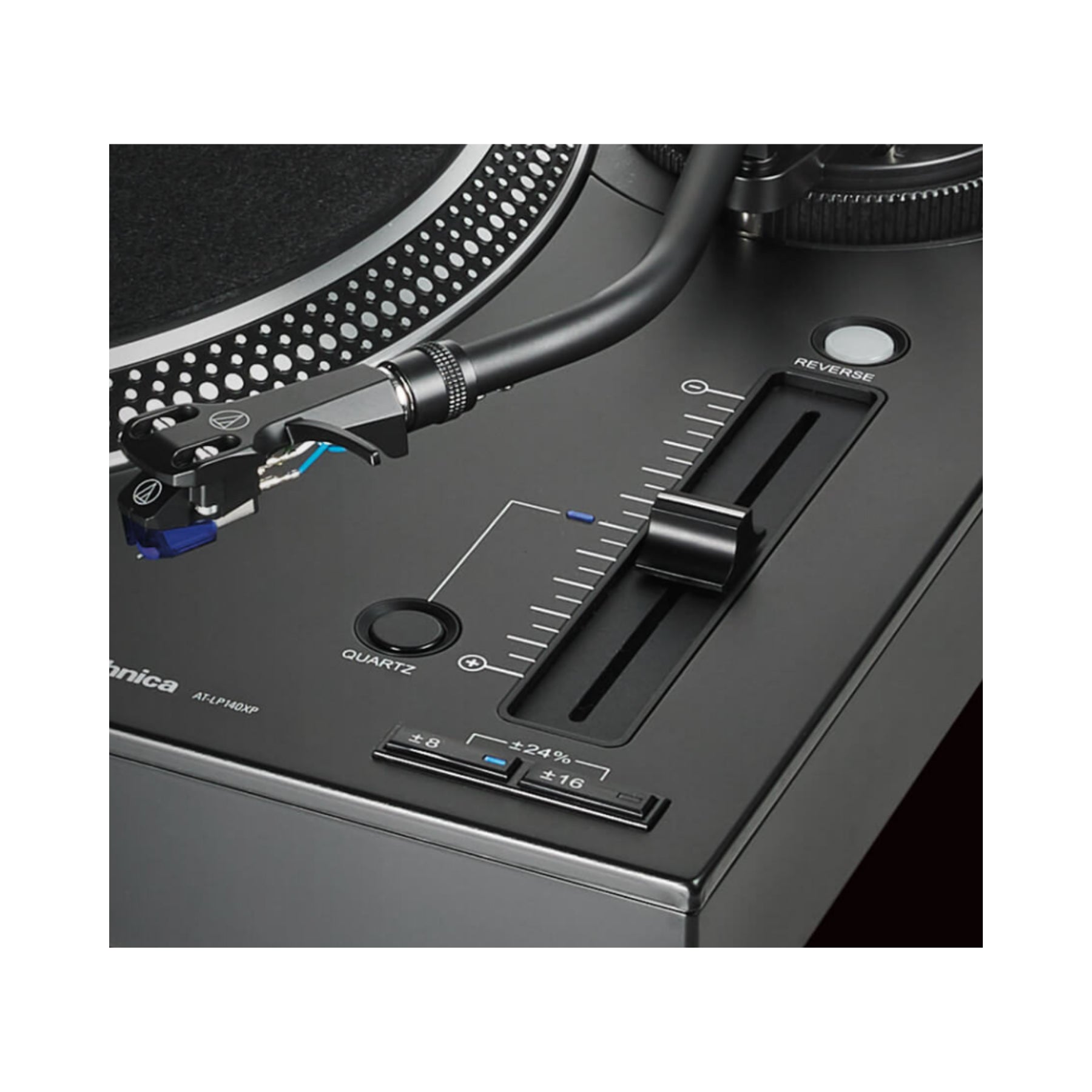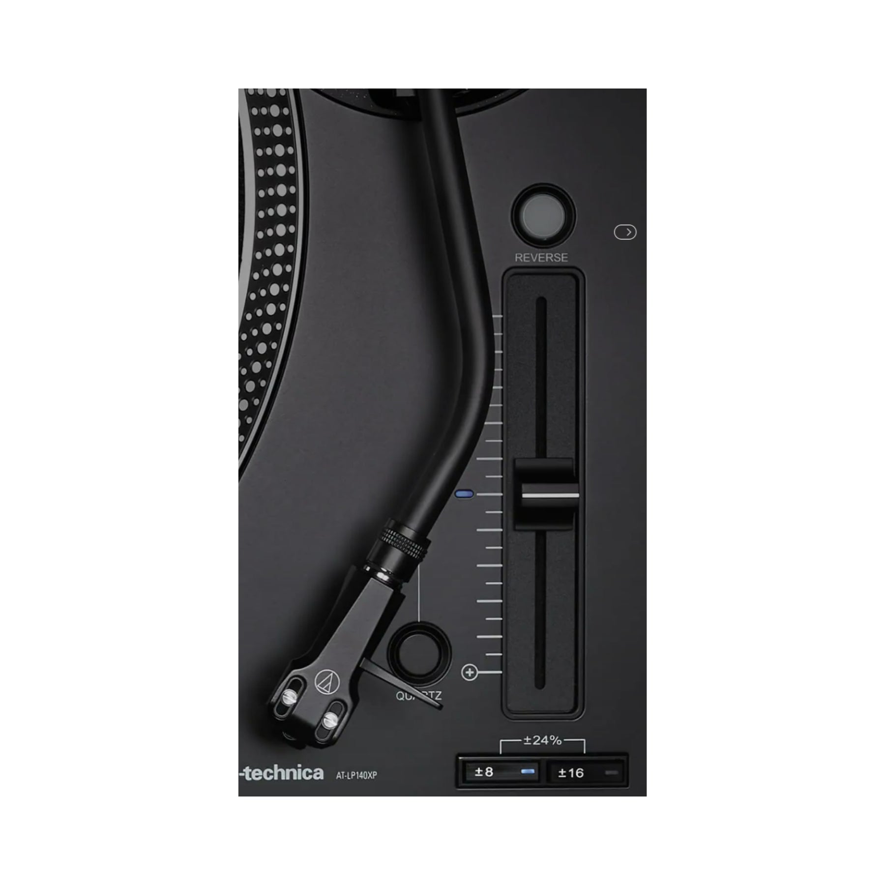 The AT-LP140XP fully manual professional DJ turntable features a high-torque direct-drive motor and anti-resonant, mass-damped, die-cast aluminum platter to ensure stable, on-axis rotation at 33-1/3, 45, and 78 RPM.