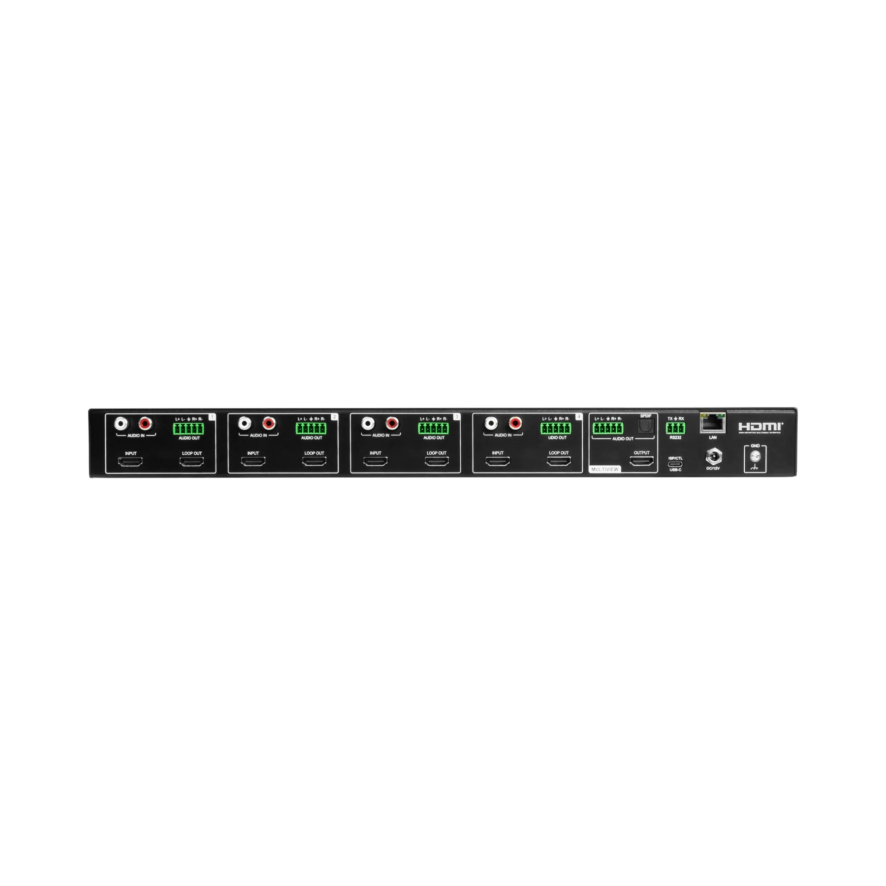 Stereo analog RCA audio inputs enable assignable alternate companion audio to HDMI signals, and 5-pin stereo audio outputs provide extracted audio from any audio format. (Note: This is not Downmixed audio. Front left and right channel content from multichannel audio codecs will playback as encoded and may not contain dialogue information).