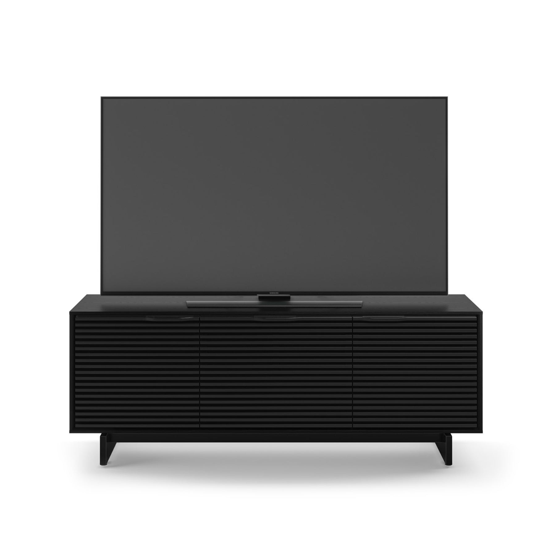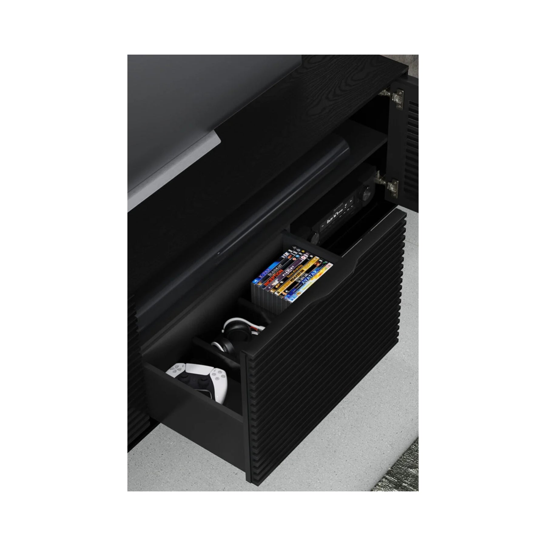 A modern console with a unique center drawer, a full-width soundbar shelf, and ample storage for movies, video games, and other media.