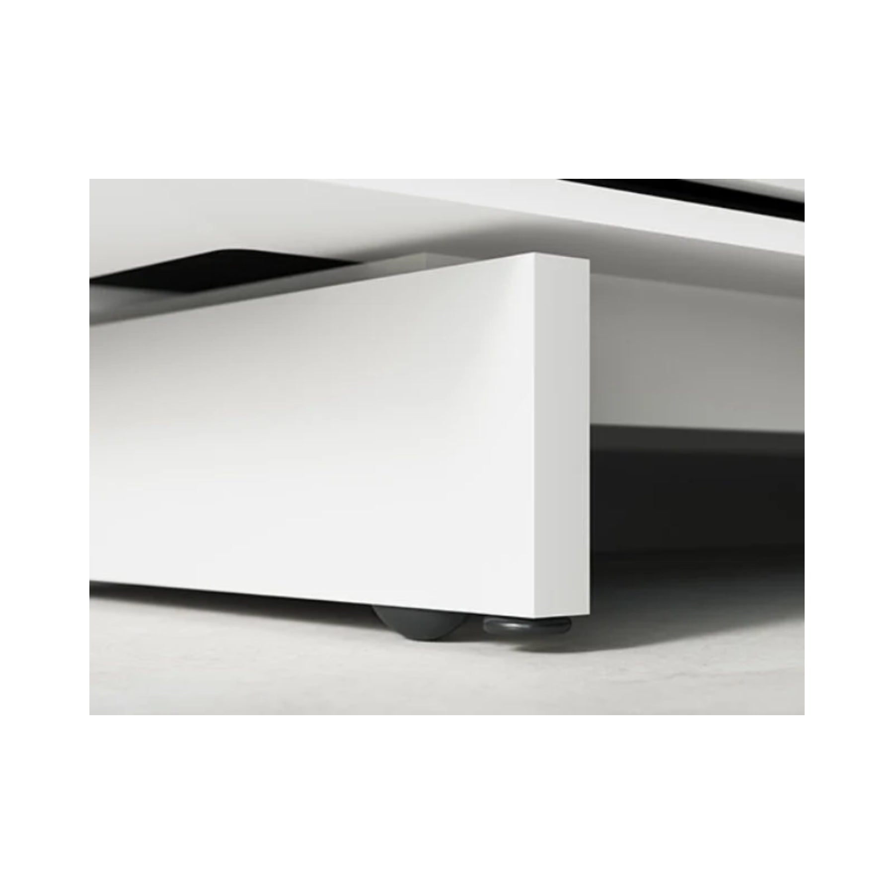 Concealed wheels make the cabinet easy to move—and cables easy to access—while maintaining the clean lines of the media base. Lower the levelers to raise it off the wheels to secure it in place. Available on the media base only.