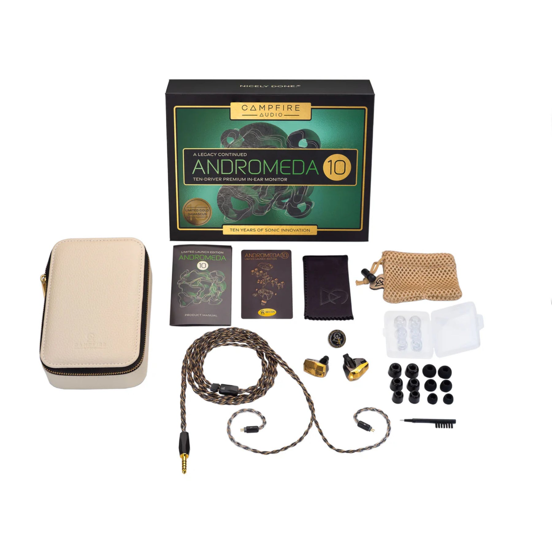 Celebrate a decade of sonic craftsmanship with the Campfire Audio Andromeda 10: SE, a limited-edition in-ear monitor that fuses the heritage of the original Andromeda with cutting-edge acoustic engineering. Featuring an all-new ten balanced-armature driver configuration, proprietary internal technologies, and stunning Damascus steel finishes, this special edition redefines clarity, detail, and immersive audio. Crafted with precision-machined PVD stainless steel shells and paired with a premium gold-plated copper cable, the Andromeda 10 SE delivers an elevated listening experience for the discerning audiophile. This is not just an evolution—it’s a celebration of ten years of innovation, sound, and design mastery.