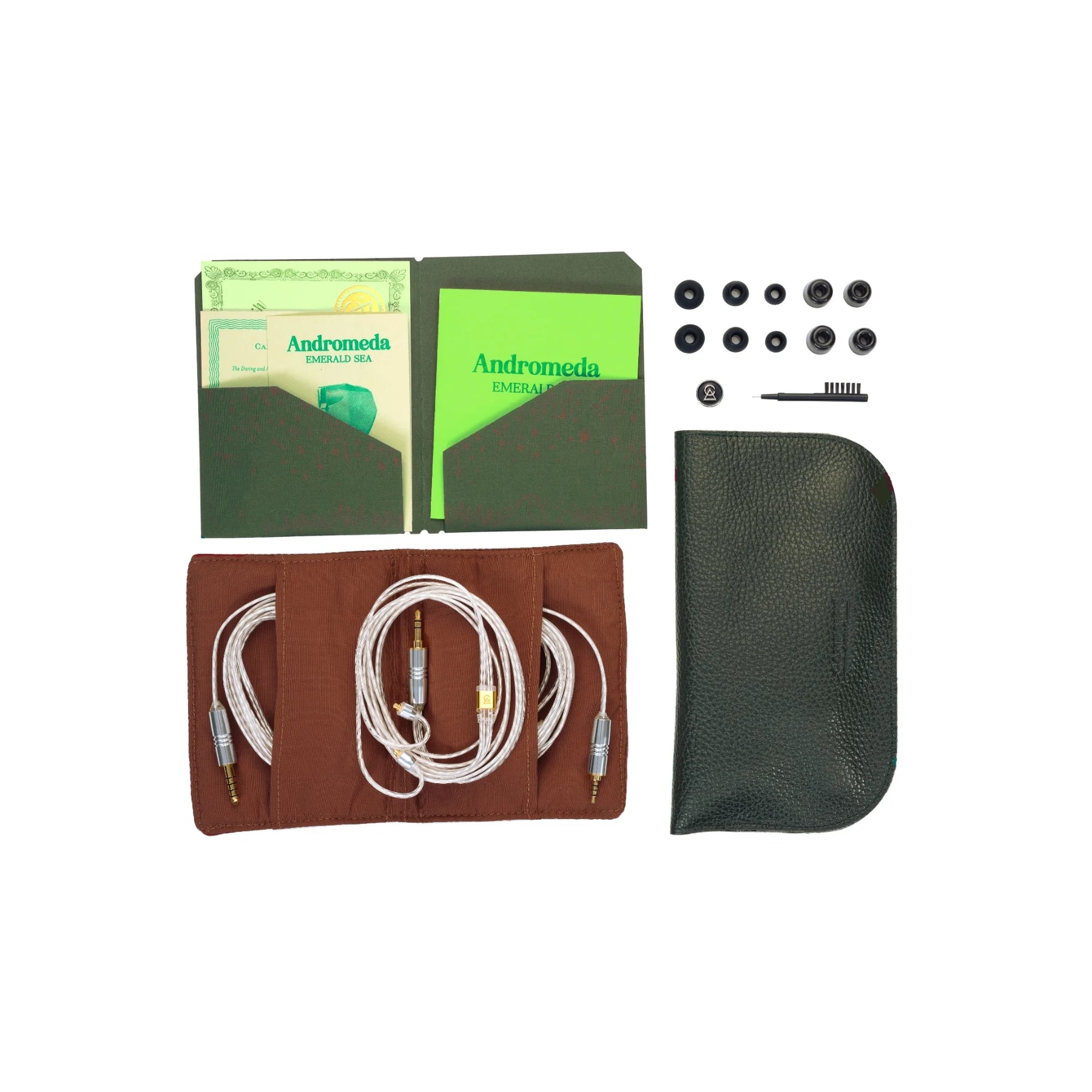 Q: What accessories come with the Emerald Sea? A: You’ll receive a handmade leather case, three cables, mesh IEM bag, foam and silicone tips (S/M/L), a cleaning tool, and a lapel pin.