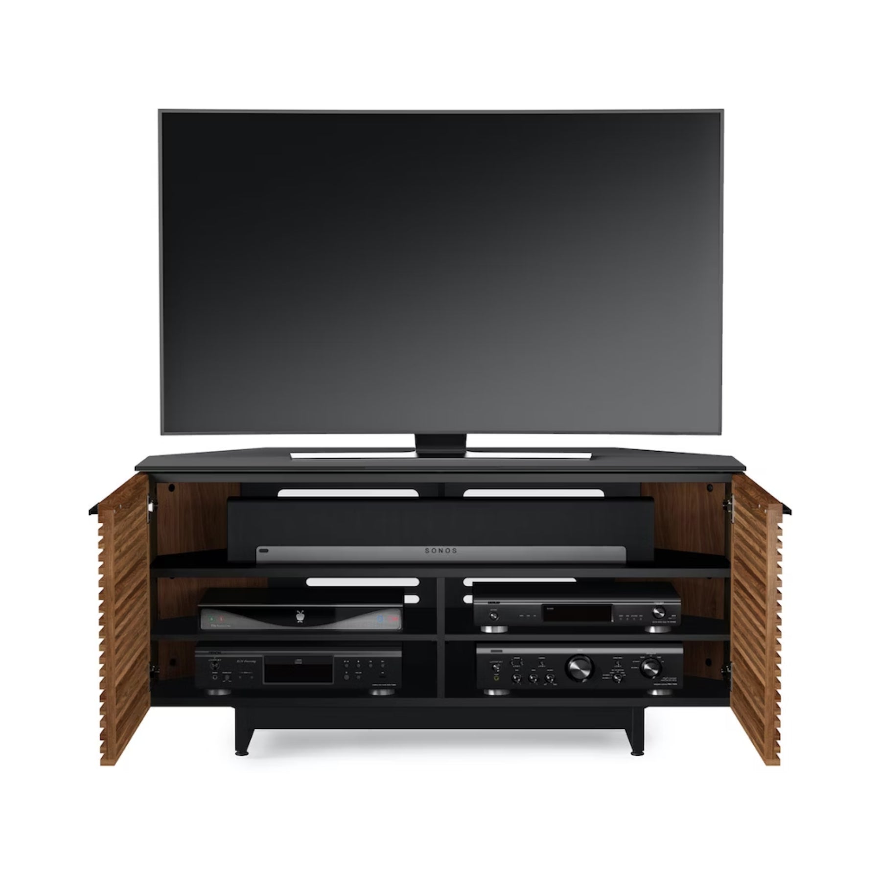 Go ahead and put baby in the corner Tucked neatly into a corner, this cabinet makes maximum use of a minimum footprint. Includes a dedicated soundbar platform and four component storage compartments, allowing for a powerful entertainment system in a small package.