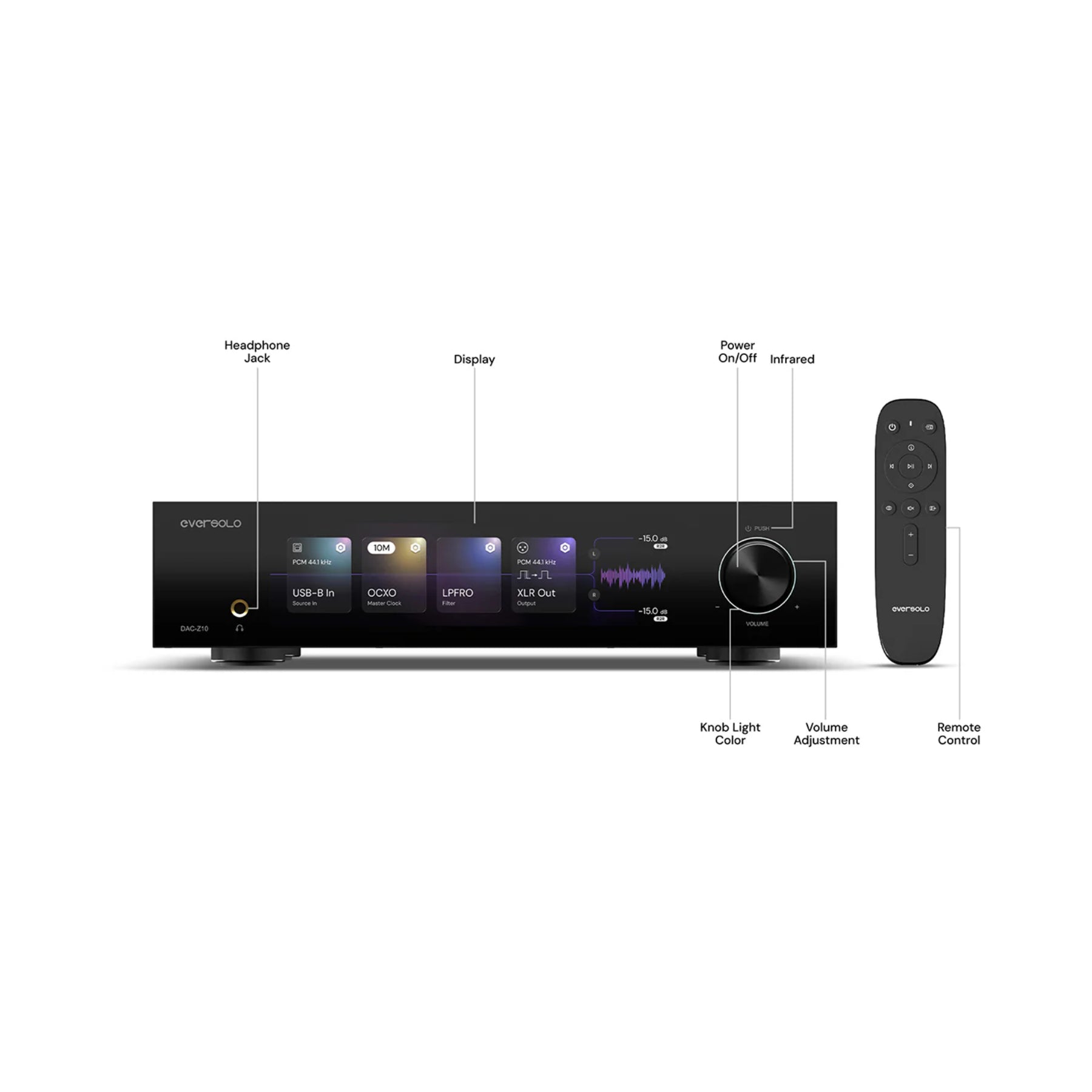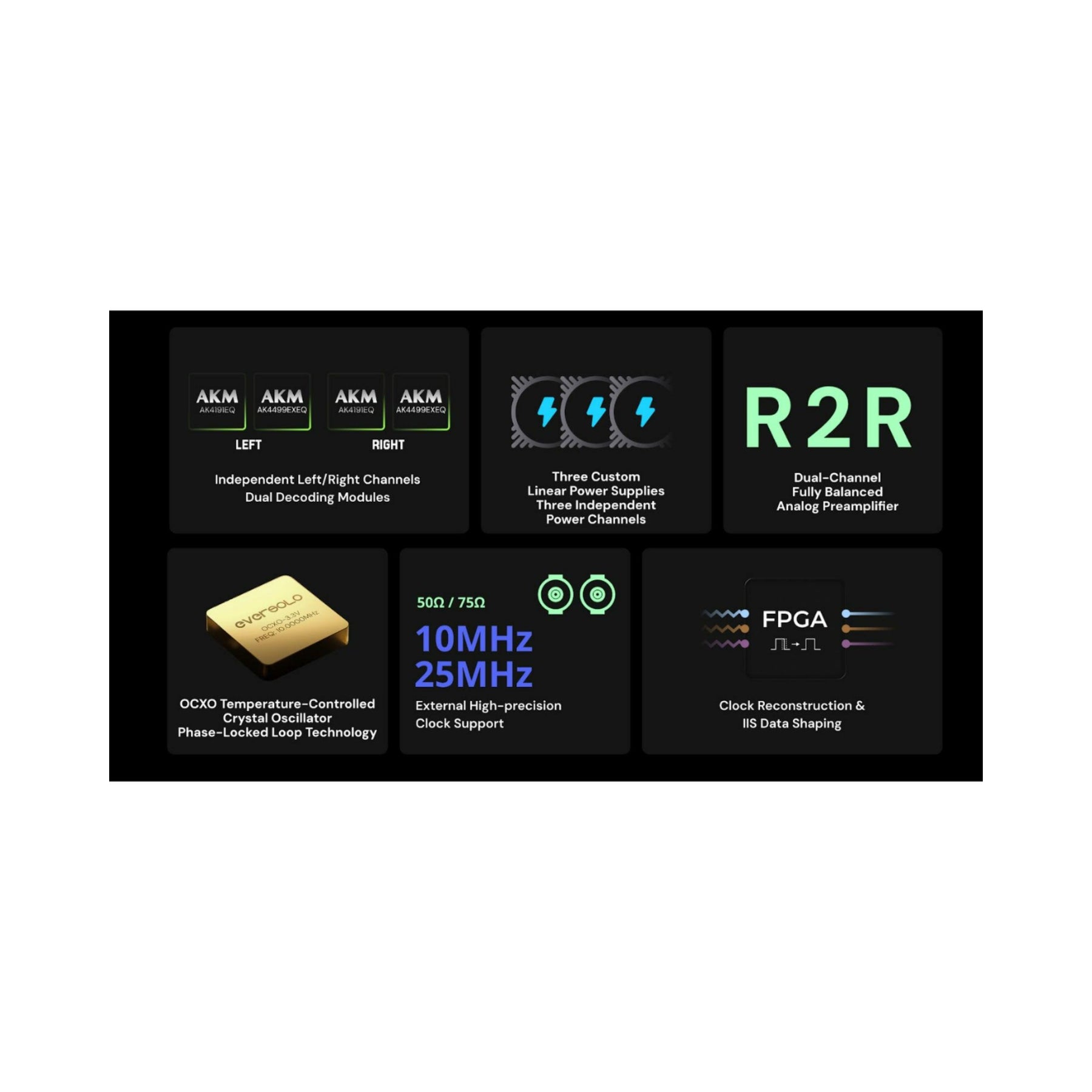 A: The DAC-Z10 features the Eversolo Precision Core™, combining a temperature-controlled OCXO oscillator, PLL tech, and FPGA-based digital clock reconstruction.