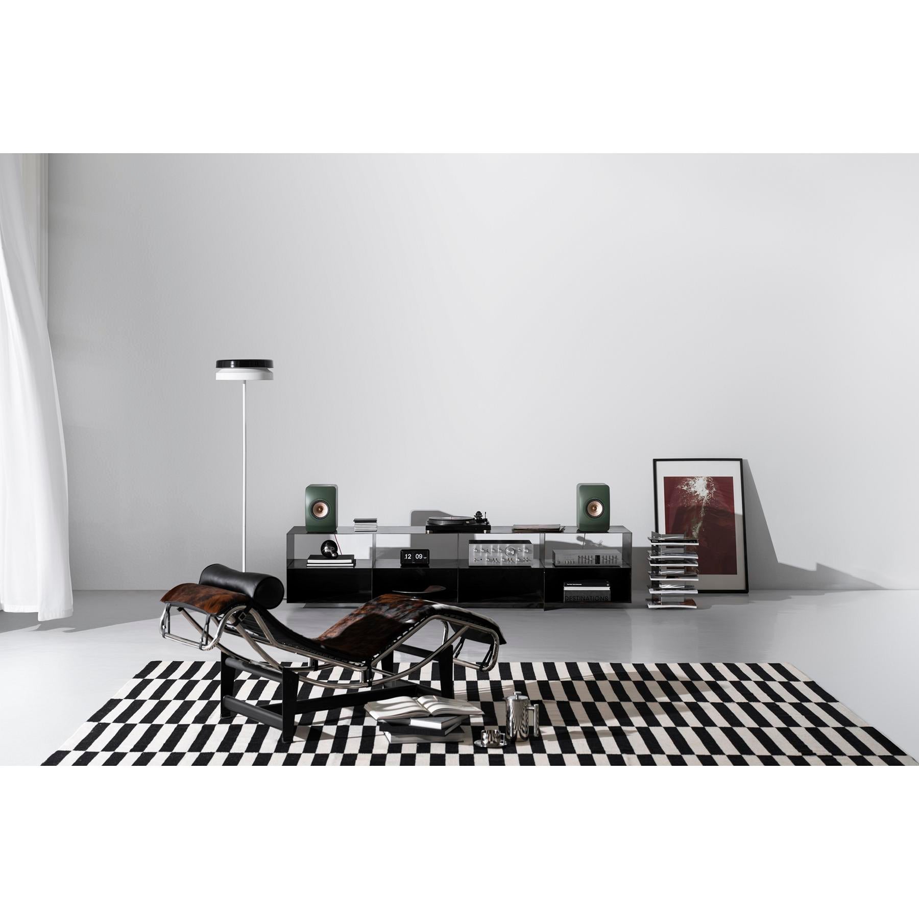 Premium Design & Finish: A curved, low‑diffraction cabinet with eye‑catching heat sinks and colour‑matched rear ports reduces cabinet resonance and diffraction. Available in Carbon Black, Mineral White, Moss Green or Sandshell, with threaded inserts to secure the speakers to KEF S2 stands.