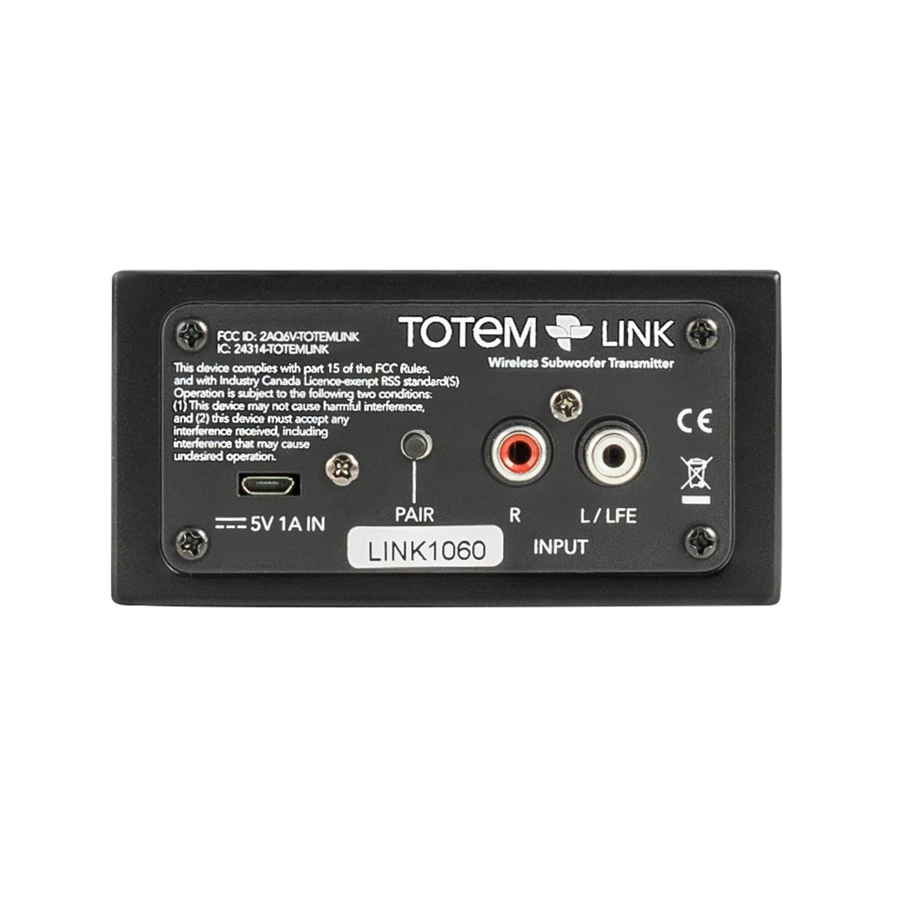 The Totem KIN Link is a compact wireless transmitter that lets you position your KIN Sub 10 or Tribe Solution subwoofer anywhere in the room without running cables. Simply connect your receiver’s subwoofer output or stereo RCA outputs to the Link’s inputs and it will transmit low‑frequency signals over a stable 2.4 GHz connection.