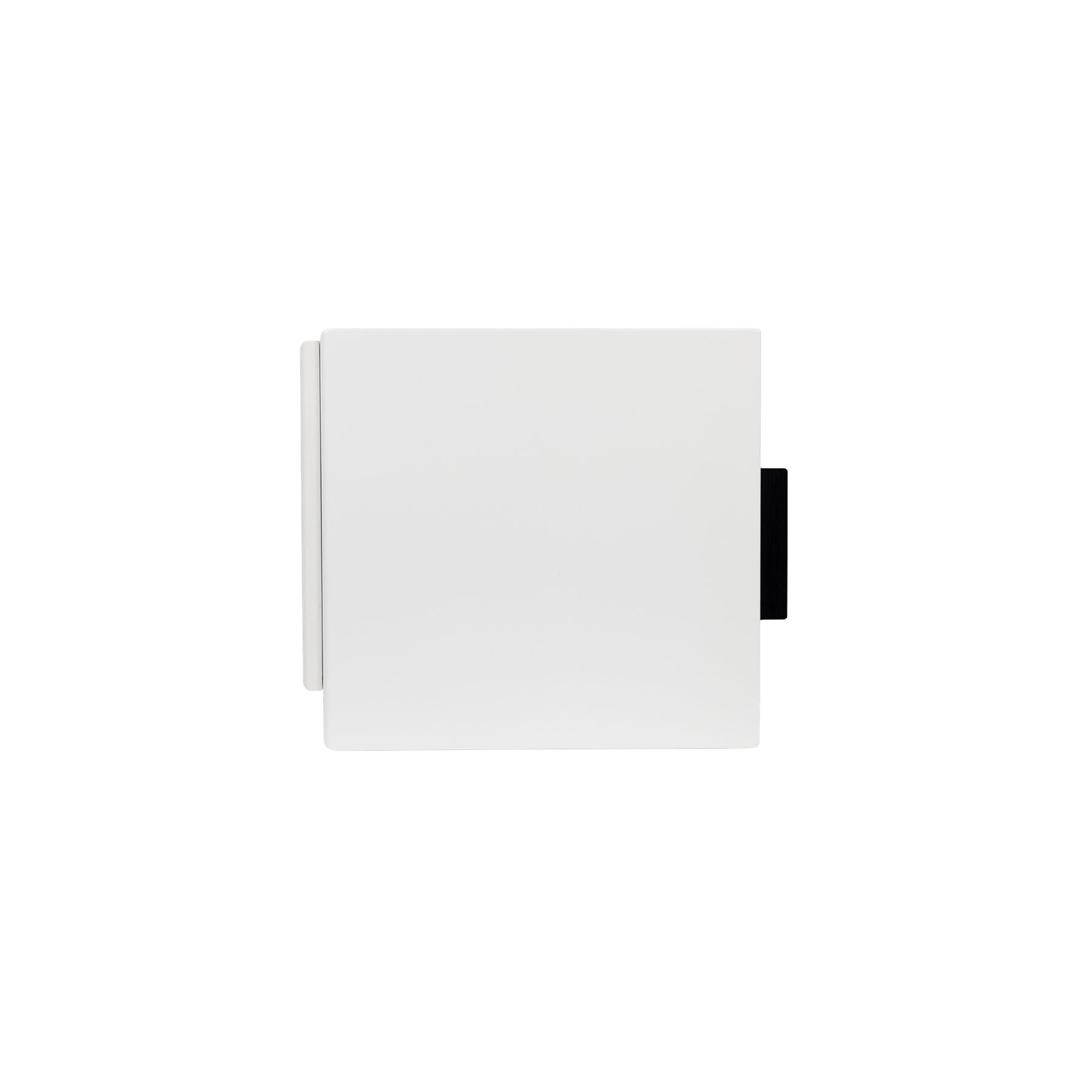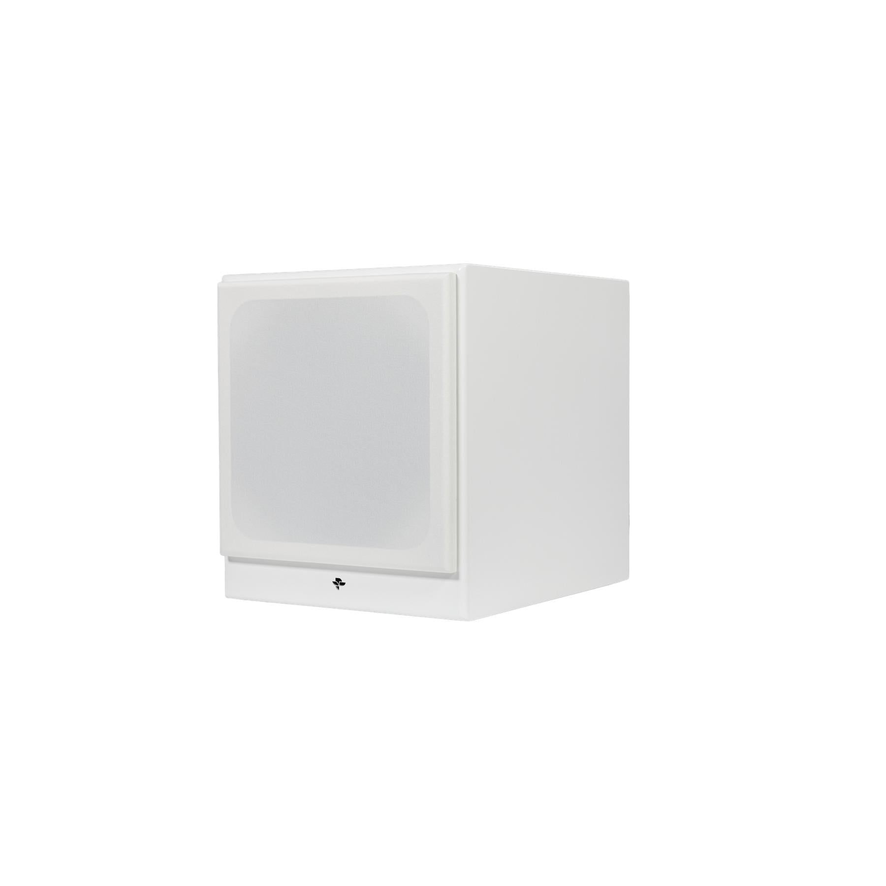 A sealed cabinet finished in satin black or white includes a magnetic grille and adhesive feet for stable placement in any décor.