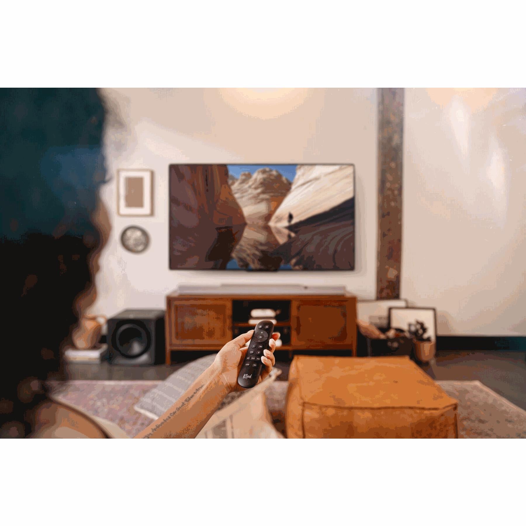 A subtle, top-mounted Klipsch badge glows for status and can be dimmed or darkened entirely for distraction-free viewing.