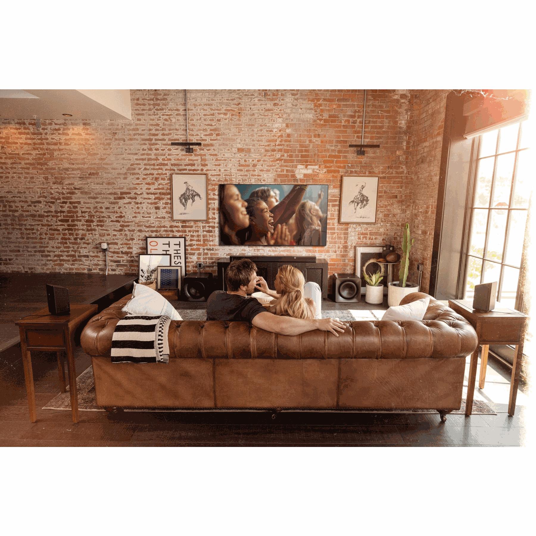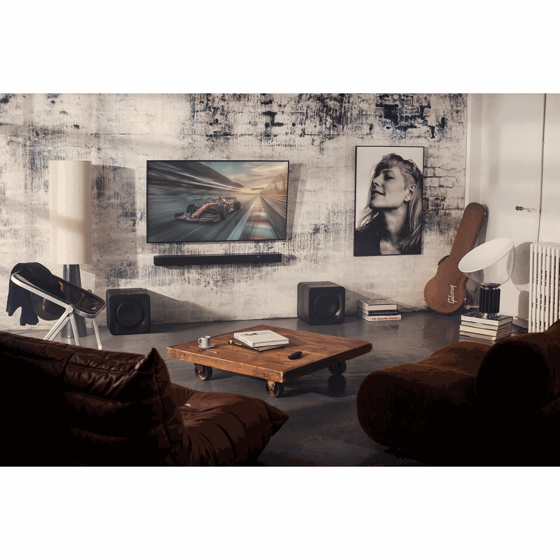 Recessed controls and muted status LEDs vanish in low light, so nothing distracts from the on-screen drama or the all-around audio.