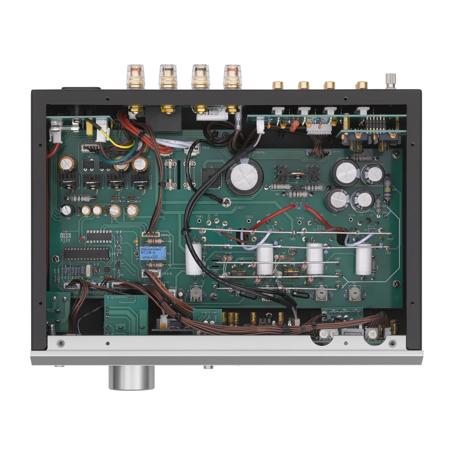 Gold-plated RCA terminals with generous spacing support upscale cabling, while the 5 mm aluminum chassis, illuminated level meters, and included aluminum-finished remote control complete the high-end experience.