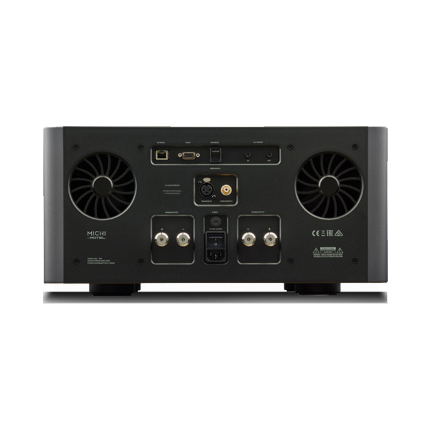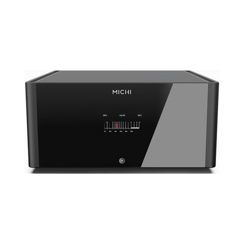 A high resolution display adorns the front panel supporting a peak power meter or spectrum analyzer. With XLR and RCA inputs, 2 sets of custom Michi speaker binding posts, remote control and fully featured RS232 and Ethernet connections the M8 provides ultimate installation flexibility. Power amplification at its best in the most elegant of industrial designs.