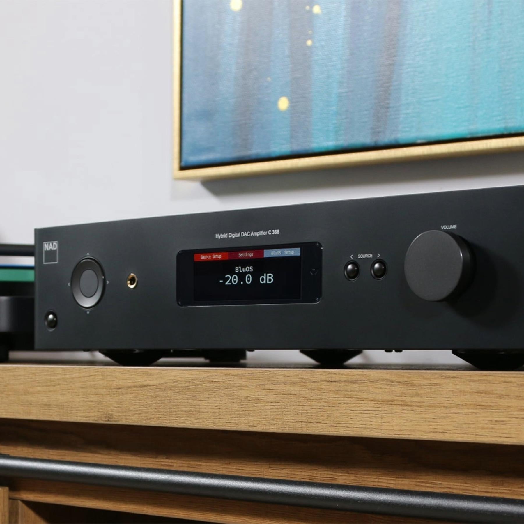 The NAD C 368 HybridDigital DAC Amplifier is a powerful integrated amp delivering 80W per channel with clean, low-noise performance for modern hi-fi systems. Its built-in high-performance DAC, optical/coax digital inputs, and Bluetooth aptX make it easy to enjoy better sound from TVs, streamers, and mobile devices. Vinyl playback is simple with a built-in MM phono stage, while the dedicated headphone amplifier supports clear private listening. With MDC expansion slots for optional upgrades like BluOS streaming and additional connectivity, the C 368 is built to evolve with your system.