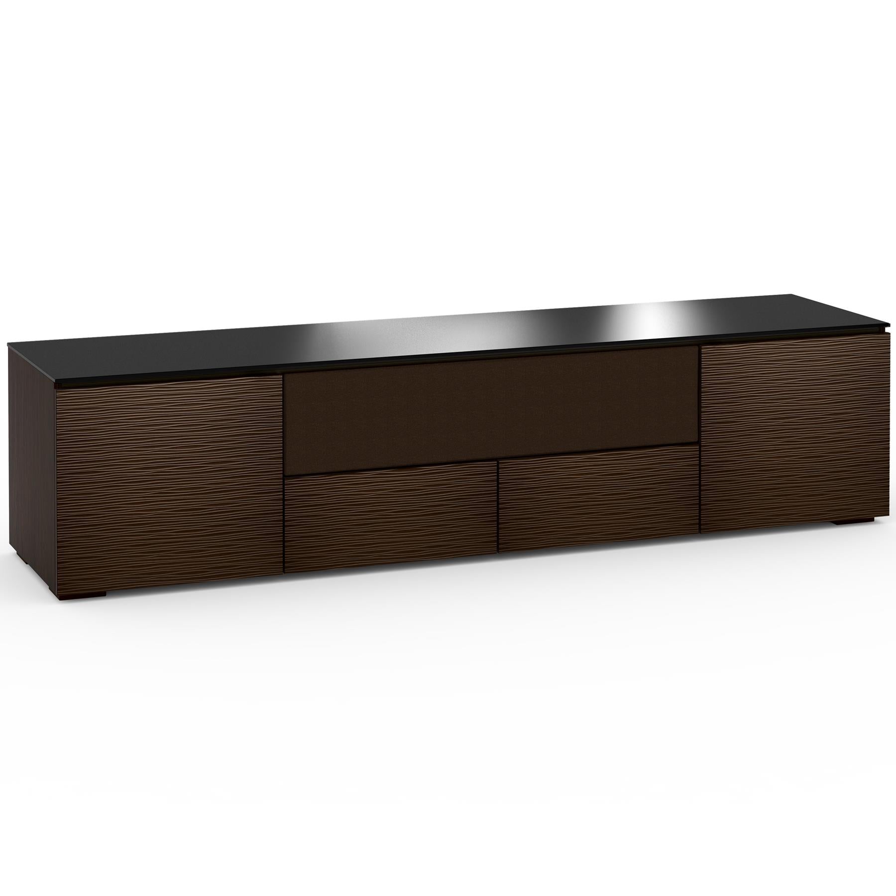 Berlin 245 is a Quad-Width AV Cabinet in Wenge finish with Wave Texture & Black Glass top. This cabinet has a distinctly European influence with its wave textured front and is recommended for TVs up to 90-inches.