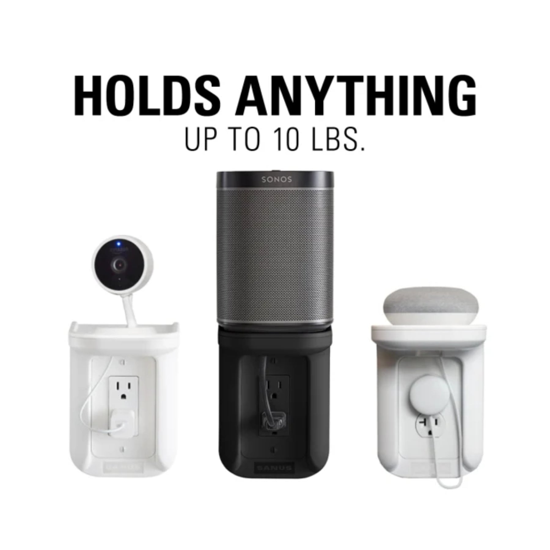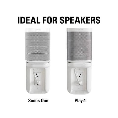 Transform your wall outlet into a clutter-free storage solution with the SANUS Outlet Shelf, perfect for smart devices and speakers like the Sonos One, PLAY:1, and more. Designed to support electronics up to 10 lbs, this shelf is both durable and sleek, integrating seamlessly into any room. Featuring built-in cable management, it routes and conceals cords for a clean, minimalist look. With no assembly required, this UL Listed shelf installs in minutes using only a screwdriver and includes both standard and Decora-style wall plate covers.