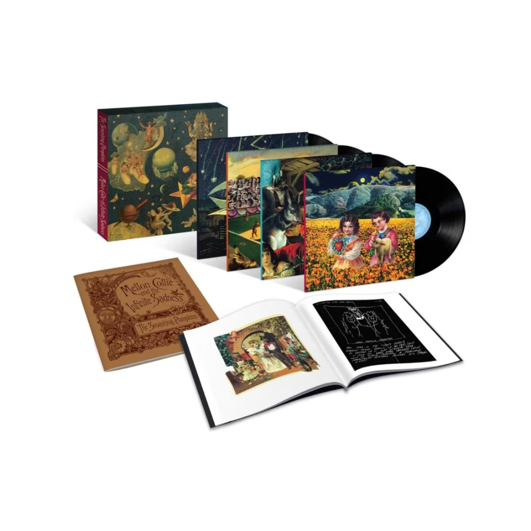 This 180g 4LP box set of *Mellon Collie and the Infinite Sadness* features a remaster from the original analog masters, offering exceptional sound quality, housed in a sturdy slipcase with two books containing personal notes, new artwork, lyrics, and more, all overseen by Billy Corgan. for a couple of seconds Experience the iconic sound of Mellon Collie and the Infinite Sadness in this 180g 4LP box set, meticulously remastered from original analog masters and presented in a 12" x 12" rigid slipcase complete with two books featuring personal notes, collage artwork, lyrics, and more.