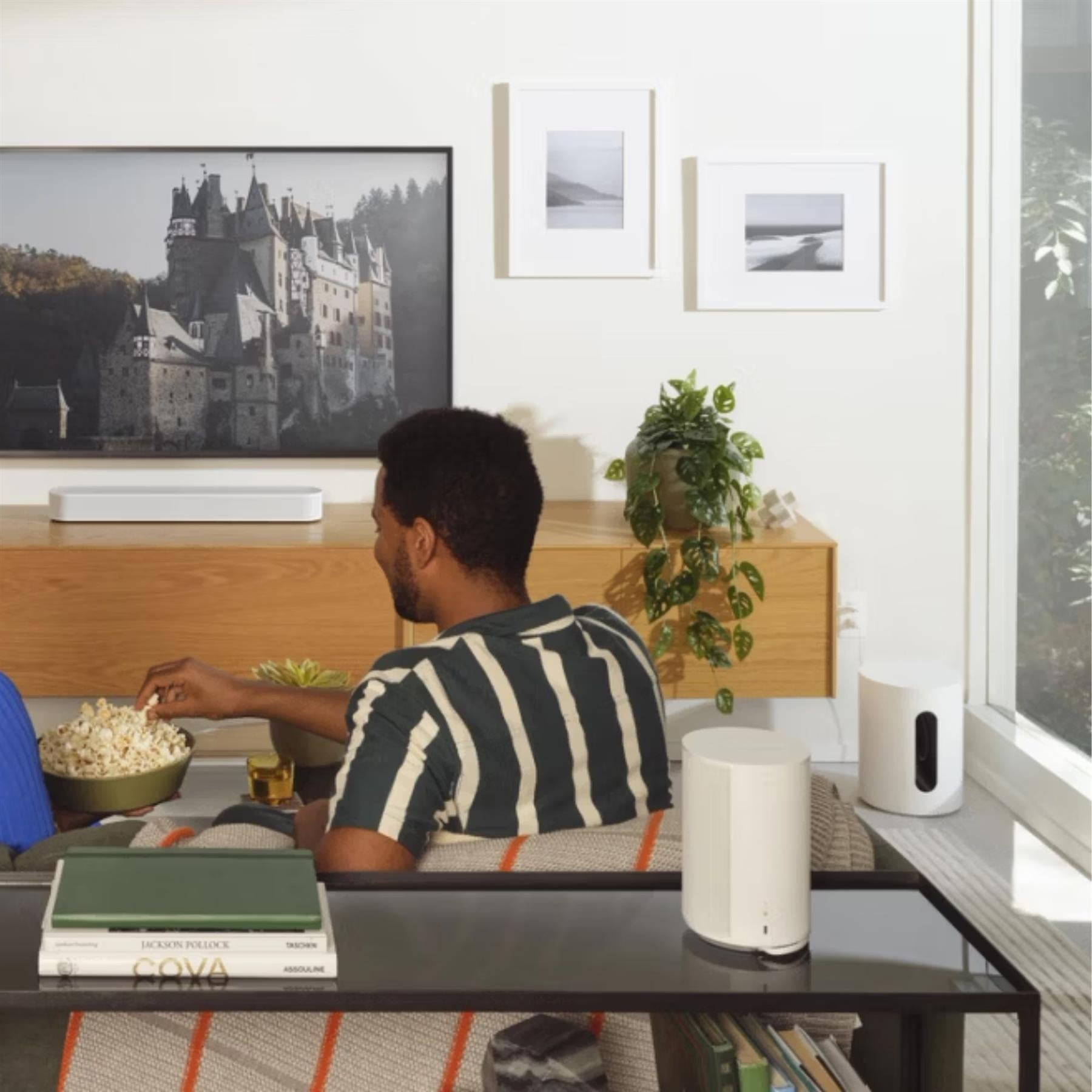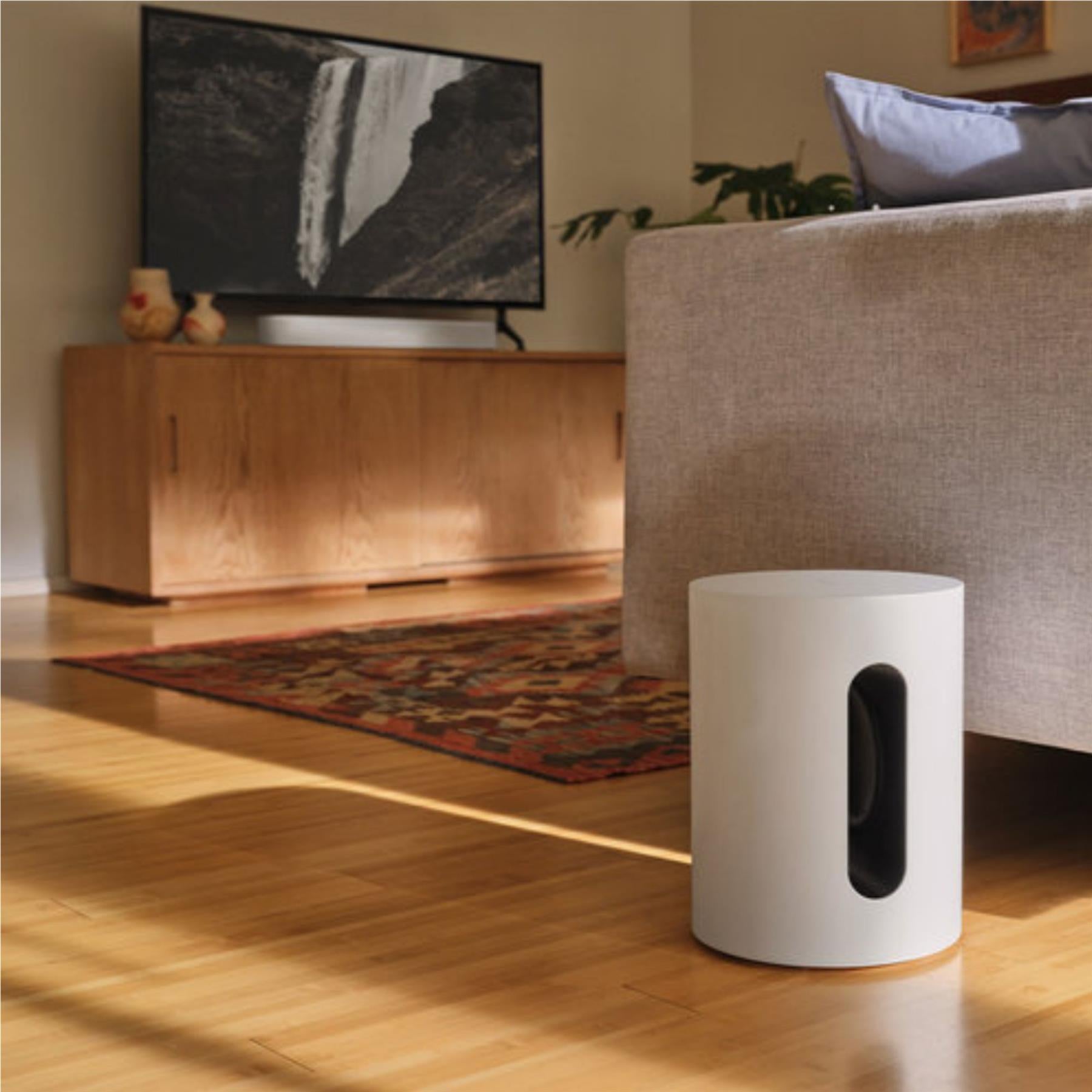 Sonos Sub Mini is the compact wireless subwoofer that brings rich, room-filling bass to your Sonos setup—without taking over your space. Pair it with Sonos Beam or Ray for more immersive TV and gaming, or match it with Era 100, One, or One SL to add deeper low end and more nuance to every track. Inside its acoustically sealed cylindrical cabinet, dual inward-facing 6" woofers deliver powerful, balanced bass while creating a force-canceling effect that helps reduce distortion, buzz, and rattle. Setup is quick with the Sonos app, and Sub Mini connects over WiFi so you can place it where it looks best—then fine-tune the sound with EQ controls and Trueplay tuning for your room.